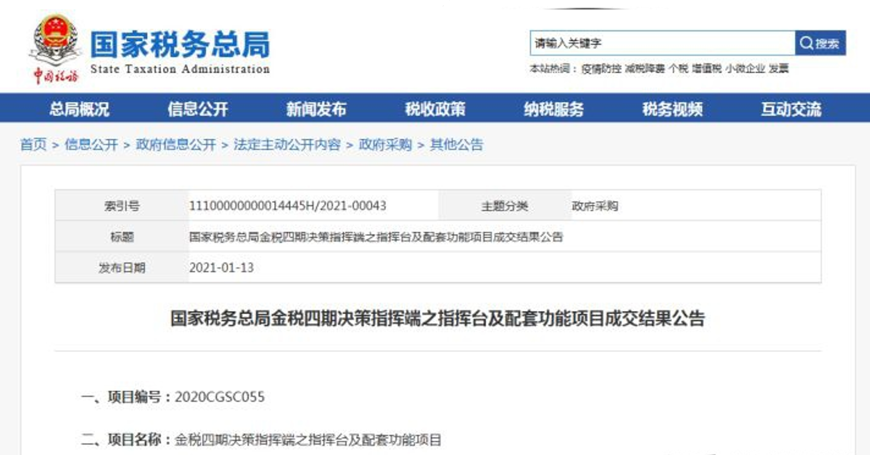 目前官方文件中,也是朋友圈用来作为“金税四期”上线作证的就是下图。讲的是金税四期决策指挥端之指挥台及配套功能项目成交。